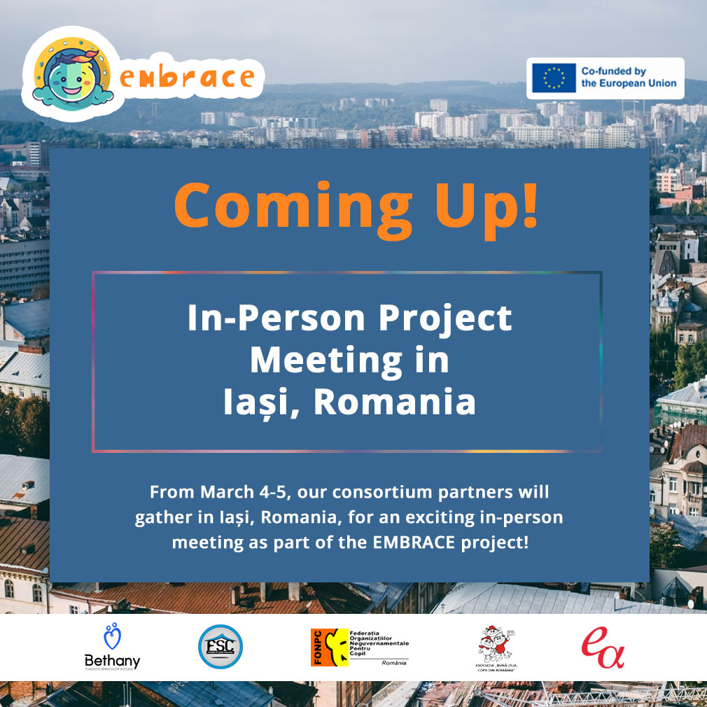 Hosted by our coordinator Fundatia Servicilor Sociale Bethany, this two-day event will bring together the EMBRACE partners from across Romania 📘Fundația de Sprijin Comunitar 🎨 Asociaţia Bună Ziua copii din România and 🛡️FONPC alongside 🇪🇸Evolutionary Archetypes Consulting SL from Spain.